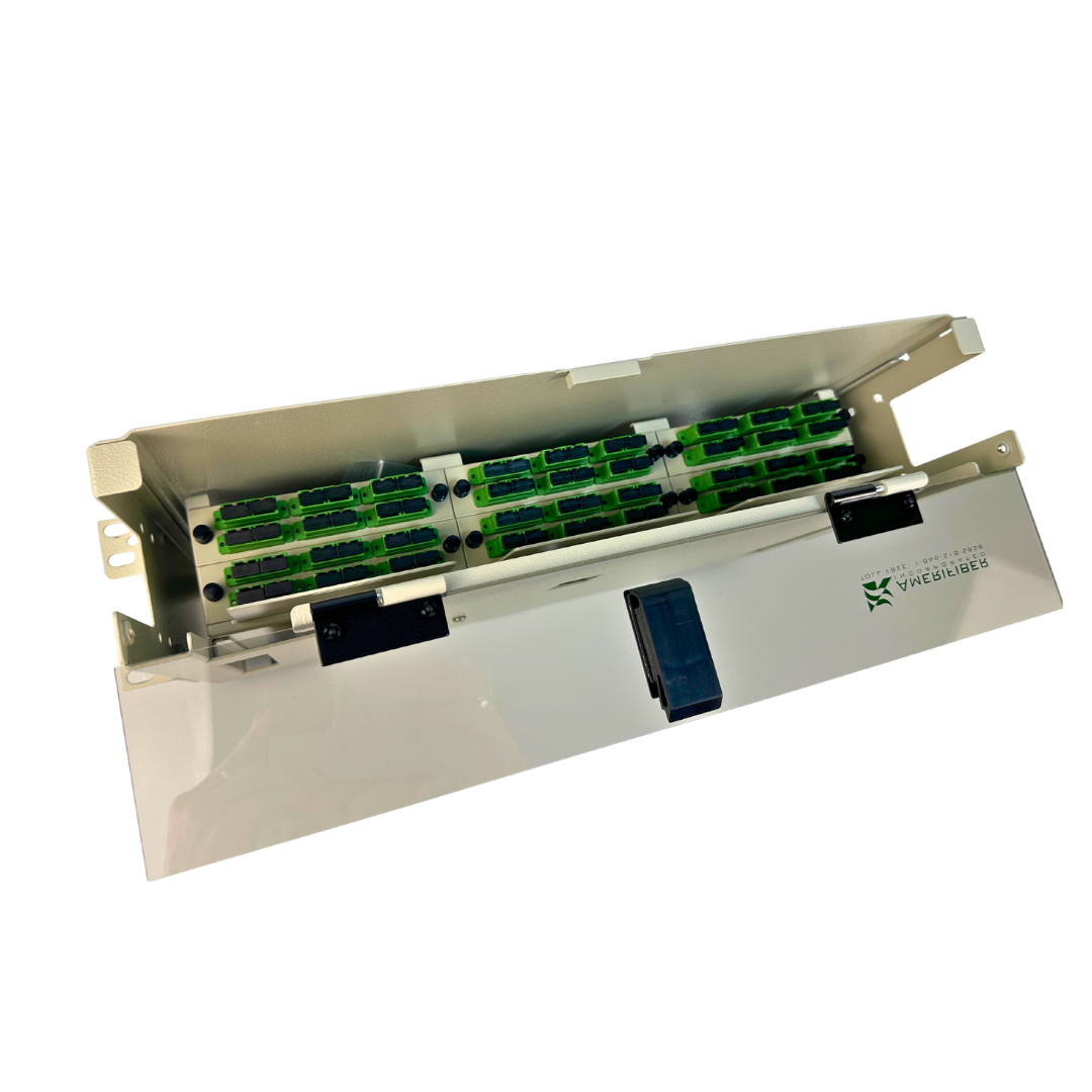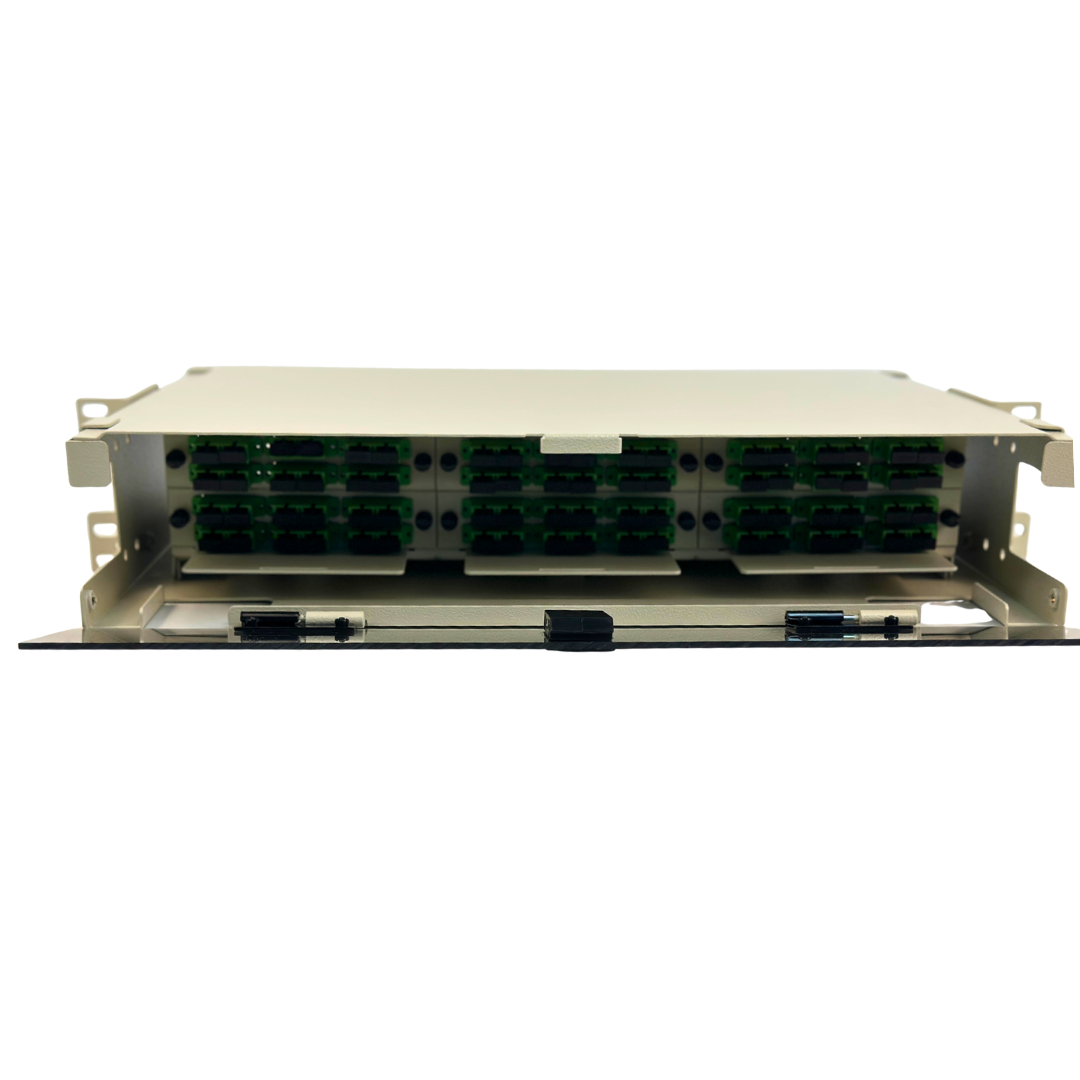 96 Port Dual Door Wall Mount w/8×12 SC Dual Row Adapter Plates, 4x24F Splice Trays, 8x12F SC/Open 3 meter Pigtails